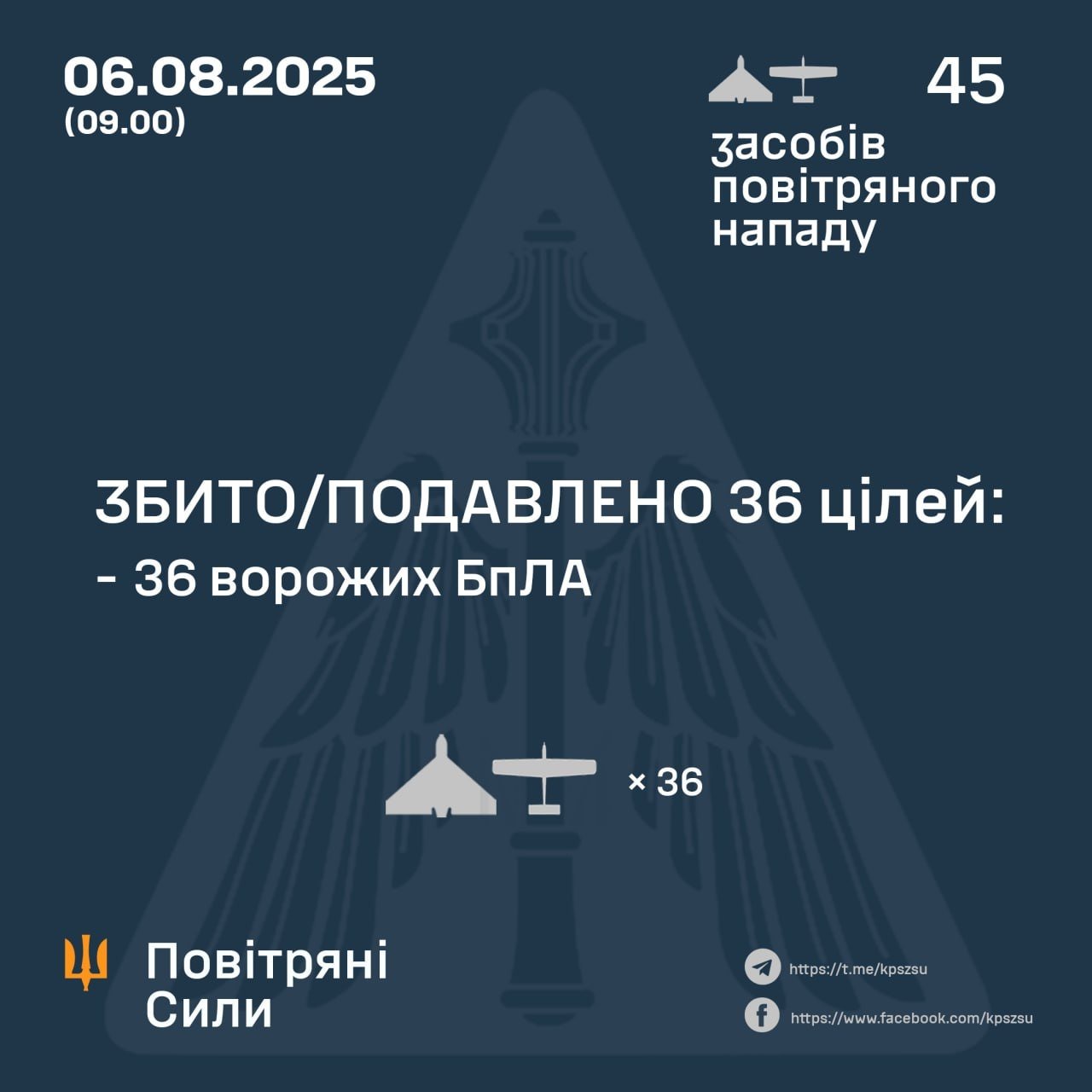 - Протиповітряною обороною збито/подавлено 36 ворожих БпЛА типу Shahed і дронів-імітаторів різних типів на півночі, півдні та сході країни.