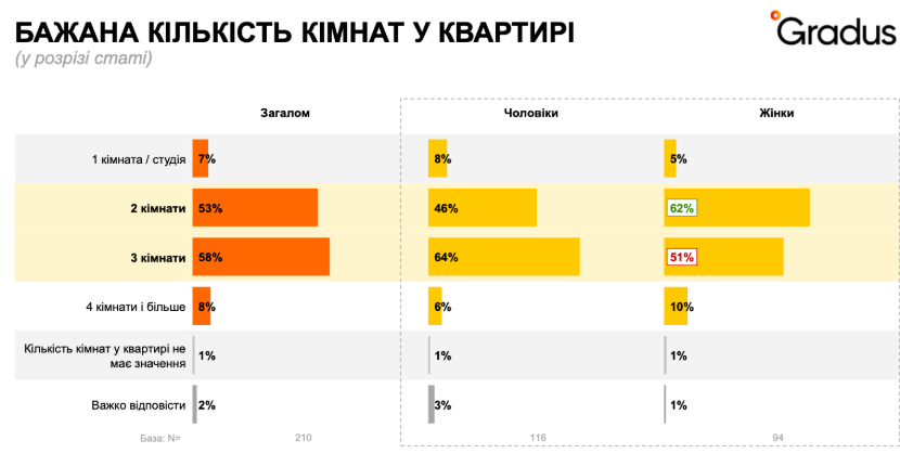 Топ-3 фактори традиційні: ціна (76%), розташування (65%) та інфраструктура навколо будинку (63%). Більшість людей сьогодні хочуть жити у три- або двокімнатних квартирах (58% та 53% відповідно).