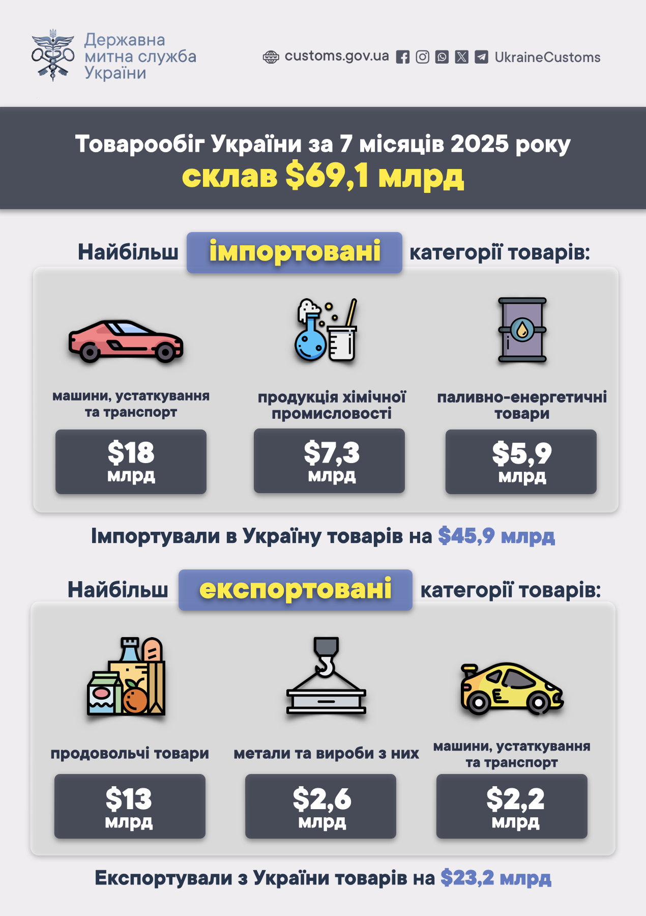 З січня по липень 2025 року в Україну імпортували товарів на суму $45,9 млрд, а експортували – на $23,2 млрд. Найбільше товарів було ввезено в країну з КНР (9,9 млрд доларів), а продано вітчизняної продукції — до Польщі (2,9 млрд доларів).