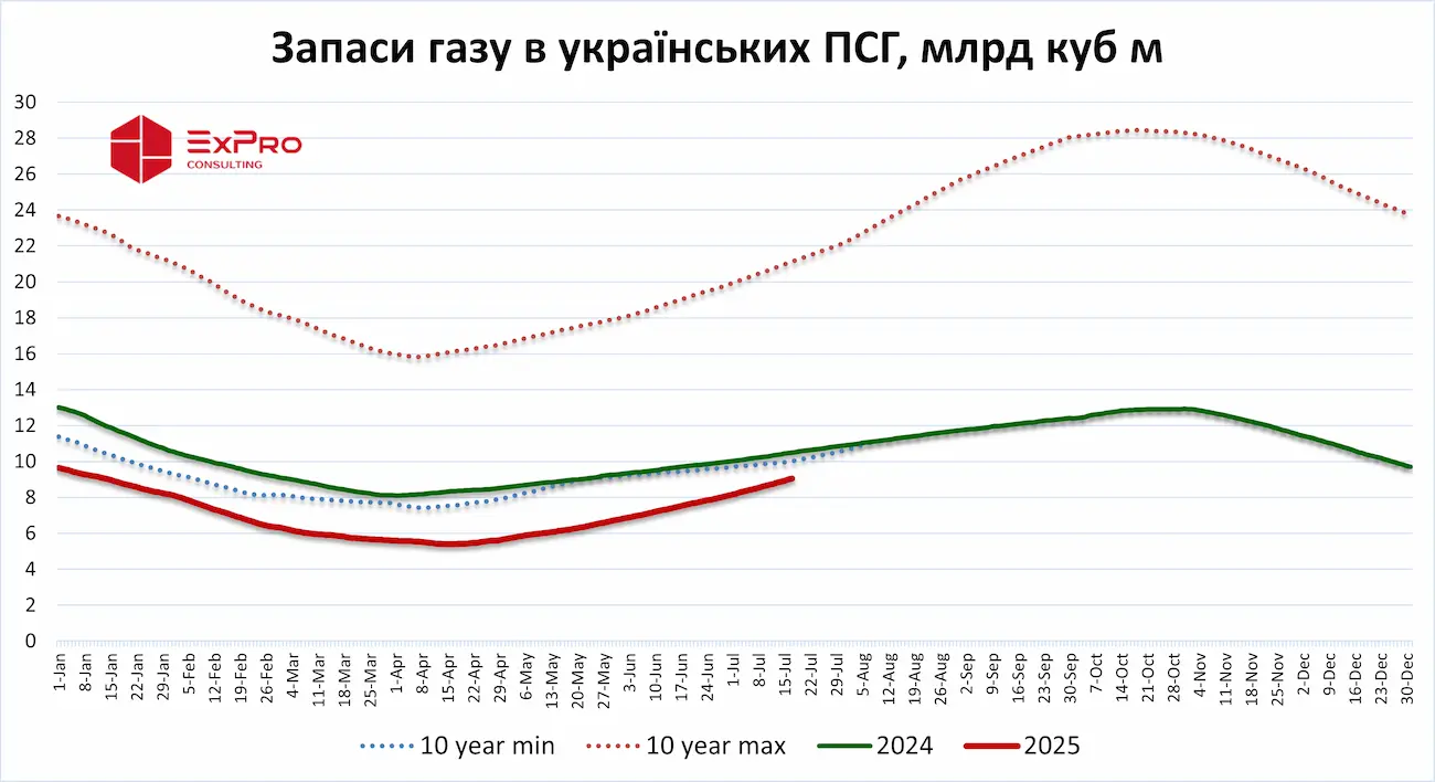 Станом на 17 липня запаси природного газу в українських підземних сховищах (ПСГ) перевищили 9 мільярдів кубометрів. Про це свідчать дані аналітичної компанії ExPro. Наразі сховища заповнені на 29,2%, що все ще на 13,9% (або 1,45 млрд кубометрів) менше, ніж на аналогічну дату минулого року.