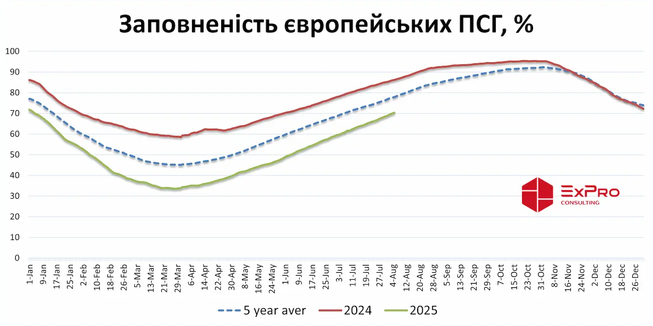 Заповненість європейських підземних сховищ газу (ПСГ) 5 серпня перевищила 70%, У ПСГ зберігається майже 75 млрд куб м природного газу. Загалом, у цей період до сховищ закачано близько 10,5 млрд куб м природного газу. Сховища Португалії заповнені на 100%, а Данія має один із найгірших показників — лише 37,5%.