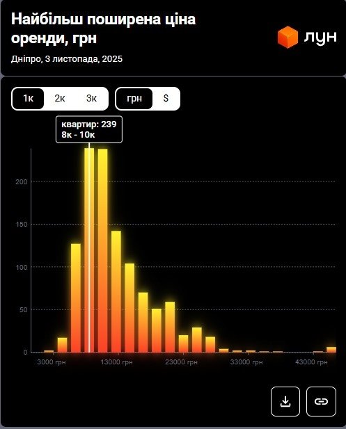 Згідно з даними ЛУН Статистика, станом на листопаді 2025 року найбільш поширена ціна оренди 1‑кімнатних квартир у Дніпрі становить 8 000 – 10 000 грн.