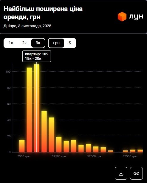 Згідно з даних ЛУН Статистика, станом на листопад 2025 року найбільш поширена ціна оренди трикімнатних квартир у Дніпрі становить 15 000 – 20 000 грн.