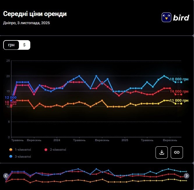 Станом на початок листопада 2025 року оренда однокімнатних квартир у Дніпрі фактично не змінилася, у порівнянні з минулим місяцем. Тобто якщо станом на початок жовтня у Дніпрі можна було орендувати однокімнатну квартиру за 11 000 грн, то на початок листопада орендувати однокімнатну квартиру можна було за таку саму ціну.