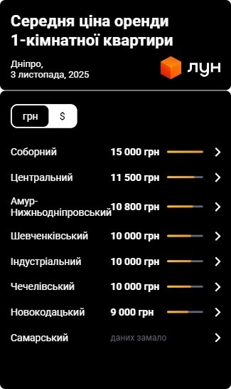 - Ціни на оренду однокімнатних квартир у Дніпрі