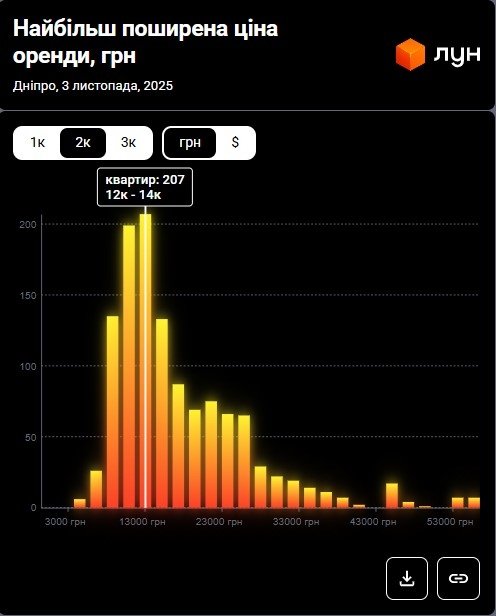 Згідно з даними ЛУН Статистика, станом на листопад 2025 року найбільш поширена ціна оренди 2‑кімнатних квартир у Дніпрі становить 12 000 – 14 000 грн.