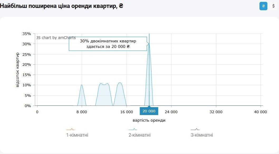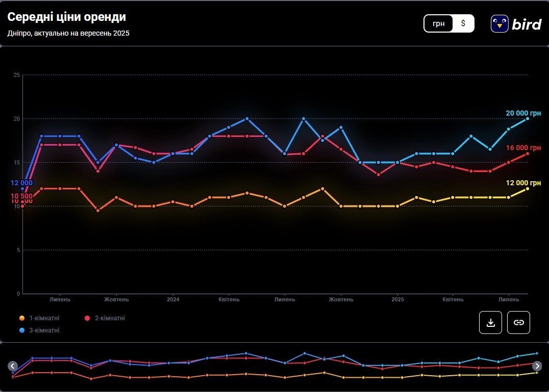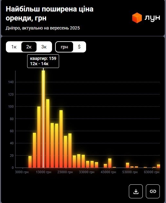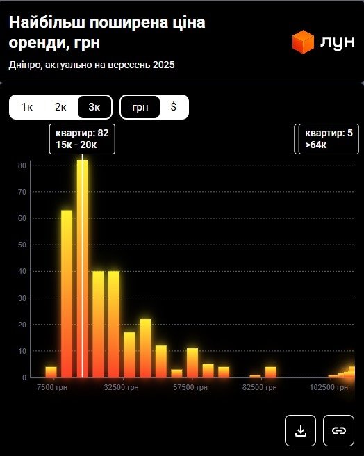 Водночас згідно з даними M2bomber, станом на вересень 2025 року найбільш поширена ціна оренди 2‑кімнатних квартир у Дніпрі становить 20 000 грн і за такою ціною здається 30% двокімнатних квартир.