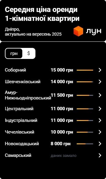 Середні ціни оренди 1-кімнатних квартир по Дніпру