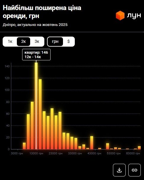 Згідно з даними ЛУН Статистика, станом на жовтень 2025 року найбільш поширена ціна оренди 2‑кімнатних квартир у Дніпрі становить 12 000 – 14 000 грн.