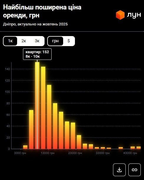 Згідно з даними ЛУН Статистика, станом на жовтень 2025 року найбільш поширена ціна оренди 1‑кімнатних квартир у Дніпрі становить 8 000 – 10 000 грн.