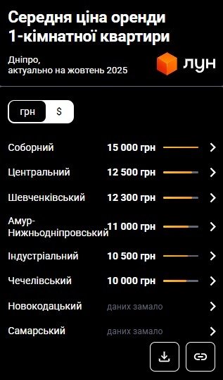 Середні ціни на оренду однокімнатних квартир по районах Дніпра