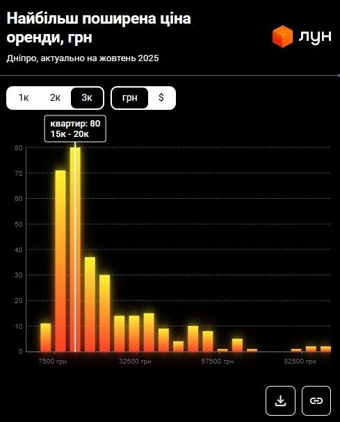 Згідно з даних ЛУН Статистика, станом на жовтень 2025 року найбільш поширена ціна оренди трикімнатних квартир у Дніпрі становить 15 000 – 20 000 грн.