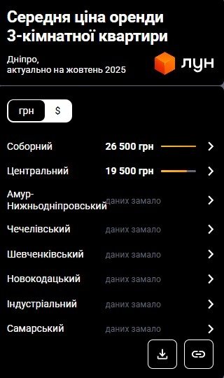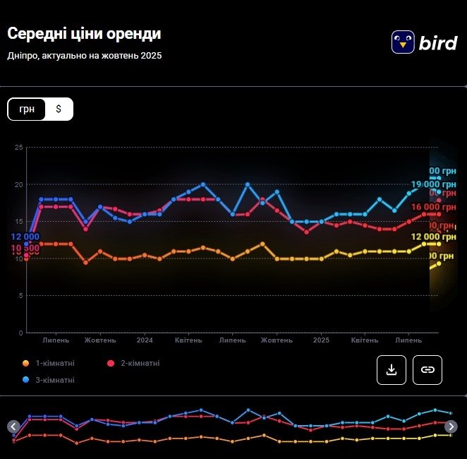 На відміну від одно- та двокімнатних квартир, середня ціна оренди трикімнатної квартири у Дніпрі навіть дещо впала – на 5%. На початку вересня 2025 оренда трикімнатних вартувала близько 20 000 грн, а на початку жовтня ціна становила 19 000 грн.