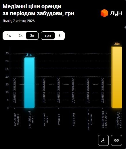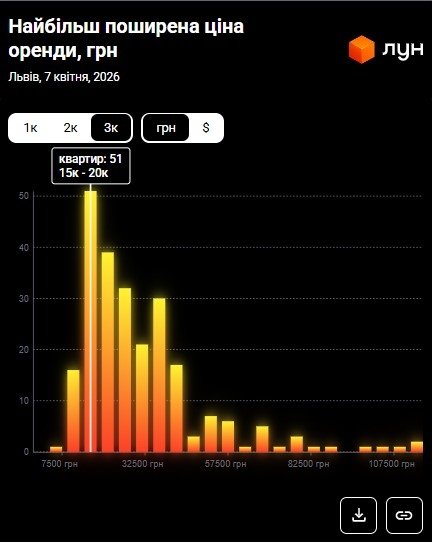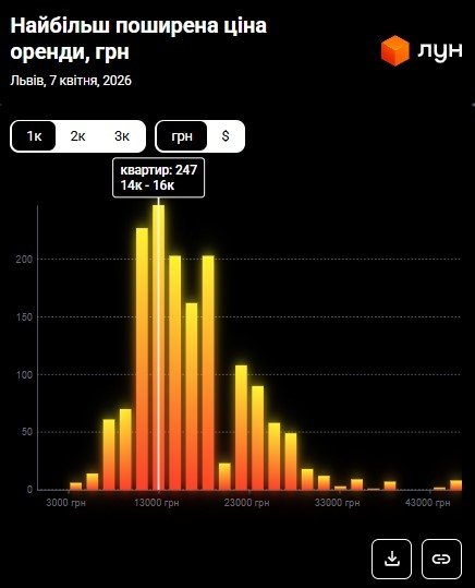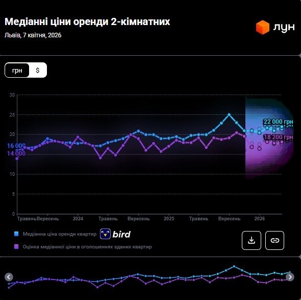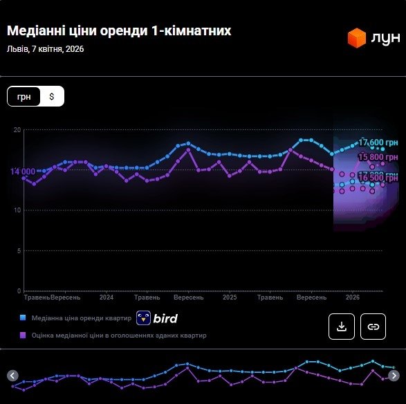 У квітні 2026 року ціни орендодавців у Львові зберігають помірну динаміку: якщо у березні «однушки» пропонували за 17 800 грн, то в квітні ціна становить 17 600 грн, тобто на 1,1% менше. Водночас орендарі продовжують адаптуватися до нових реалій ринку: середня сума фактичних договорів утримується в районі 15 400 гривень на місяць, тобто на 2,53% менше ніж минулого місяця (15 800 грн).
