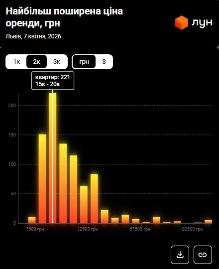 Згідно з даними ЛУН Статистика, станом на квітень 2026 року найбільш поширена ціна оренди двокімнатних квартир у Львові становить 15 000 – 20 000 грн. Тобто найбільше пропозицій по оренді двокімнатних квартир (221) припадає саме на цей ціновий діапазон, що можна побачити на інфографіці нижче.