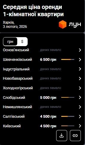 Середні ціни оренди 1-кімнатних квартир по Харкову
