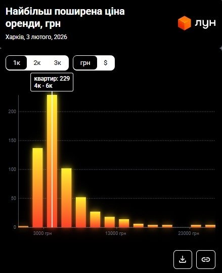 Згідно з даними ЛУН Статистика, станом на лютий 2026 року найбільш поширена ціна оренди 1‑кімнатних квартир у Харкові становить 4 000 – 5 000 грн.