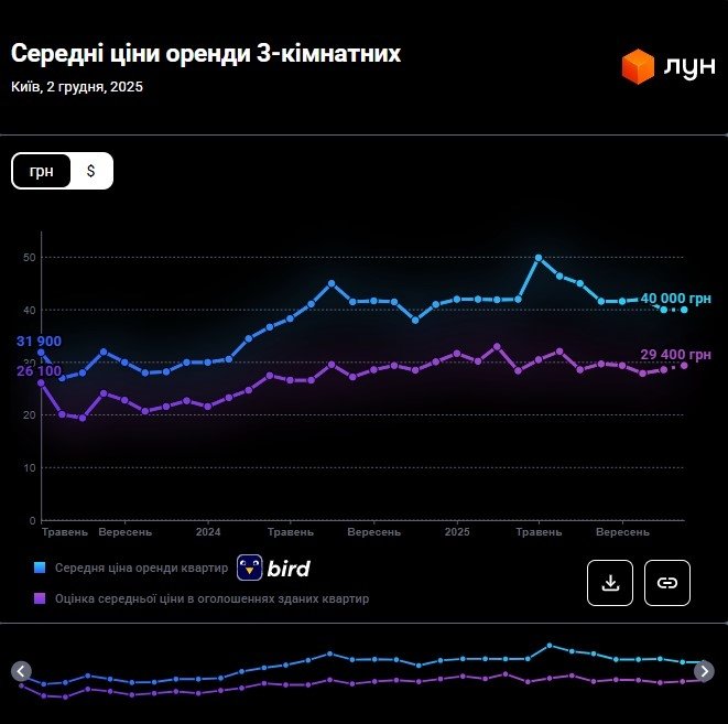 Водночас середня ціна на оренду трикімнатних квартир в оголошеннях становить 40 000 грн. Ціна залишилася незмінною порівняно з попереднім місяцем.
