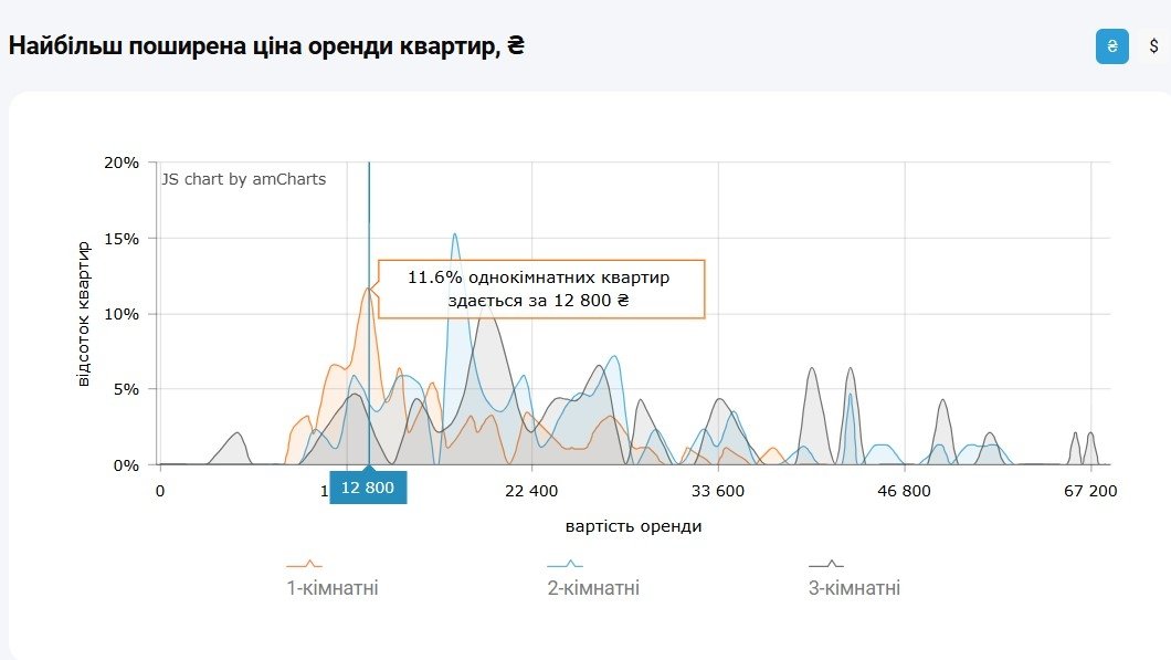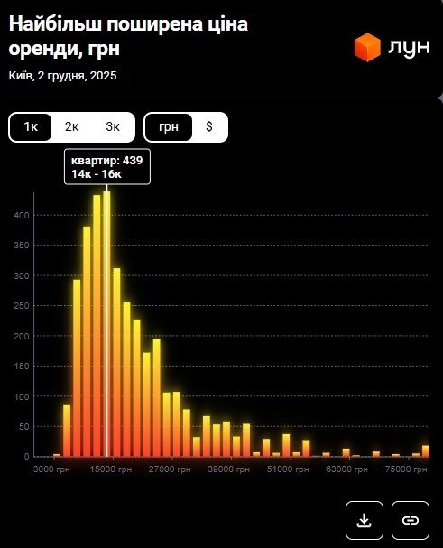 Водночас за даними M2bomber, станом на грудень 2025 року найбільш поширена ціна оренди 1‑кімнатних квартир у Києві становить 12 800 грн, і за такою вартістю здається 11.6% однокімнатних квартир.