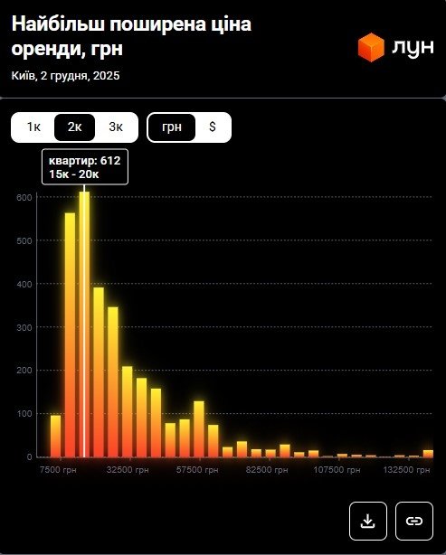 За даними ЛУН Статистика, станом на грудень 2025 року найбільш поширена ціна оренди двокімнатних квартир у Києві знаходиться в діапазоні 15 000 – 20 000 грн.