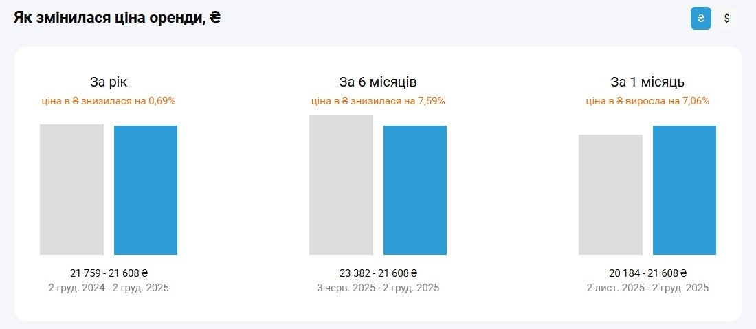 У грудні 2025 року столичний ринок орендного житла демонструє помірні зміни. За даними порталу M2bomber, середня вартість оренди квартир у Києві знизилася на 7,06% за останній місяць та на 0,69% порівняно з аналогічним періодом минулого року.