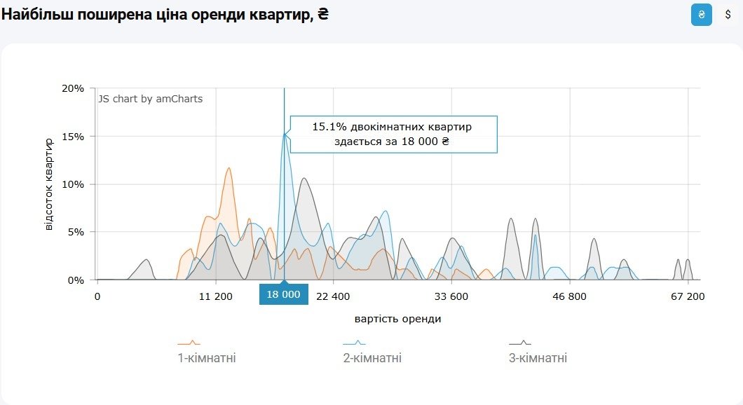 Водночас за інформацією M2bomber, станом на грудень 2025 року найбільш поширена ціна оренди двокімнатних квартир у Києві становить 18 000 грн, за такою вартістю здається 15.1% двокімнатних квартир в Києві.