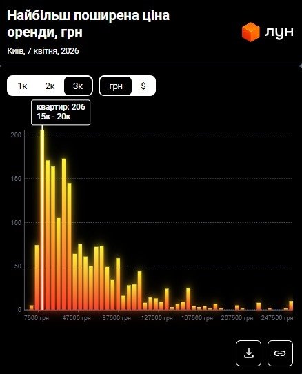 За даними ЛУН Статистика, станом на квітень 2026 року найбільш поширена ціна оренди трикімнатних квартир у Києві знаходиться в діапазоні 15 000 – 20 000 грн. Тобто найбільша кількість пропозицій з оренди трикімнатних квартир (206) припадає саме на цей ціновий проміжок, що можна побачити на інфографіці нижче.