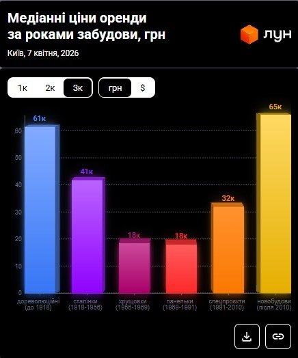 Новобудови приваблюють орендарів сучасним плануванням, якісним ремонтом, наявністю ліфтів, паркувальних місць та розвиненою інфраструктурою. Старіші будинки оцінюються за доступнішу ціну та часто вигідне розташування в історичних або транспортно зручних районах столиці.