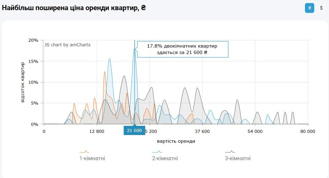 Водночас за інформацією M2bomber, станом на квітень 2026 року найбільш поширена ціна оренди двокімнатних квартир у Києві становить 21 600 грн, за такою вартістю здається 17.8% двокімнатних квартир.