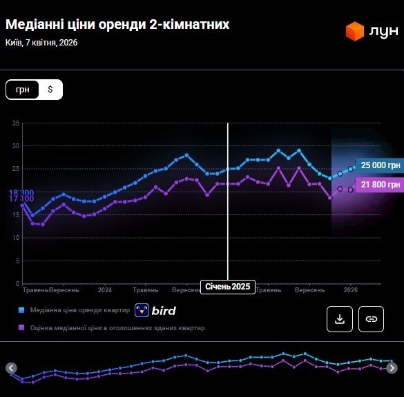 Станом на початок квітня 2026 року оренда двокімнатних квартир у Києві фактично не змінилася, порівняно з попереднім місяцем. Якщо на початку березня середня вартість становила від 20 800 гривень (за укладеними договорами) до 25 000 грн (пропозиції від орендодавців), то в квітні ці показники залишаються в схожому діапазоні згідно з даними ЛУН Статистика.