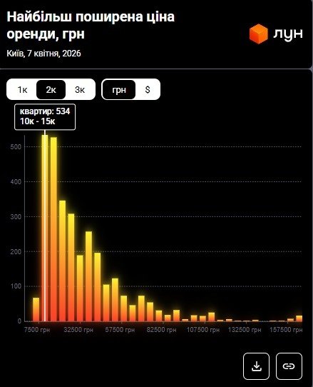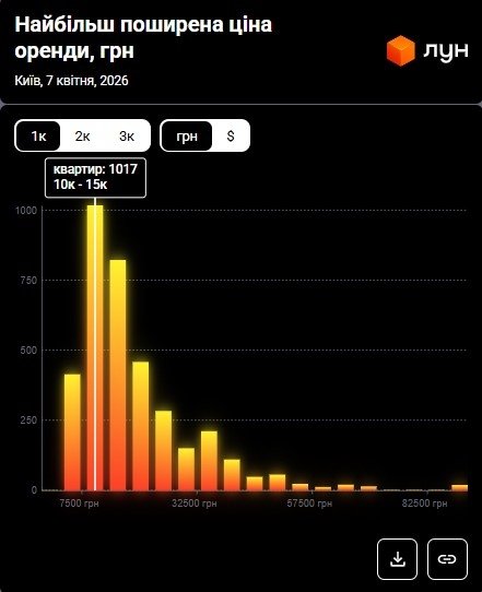 За інформацією ЛУН Статистика, станом на квітень 2026 року найбільш поширена ціна оренди 1‑кімнатних квартир у Києві знаходиться в діапазоні 10 000–15 000 грн. Тобто найбільша кількість пропозицій з оренди однокімнатних квартир (958) припадає саме на цей ціновий проміжок, що можна побачити на інфографіці нижче.