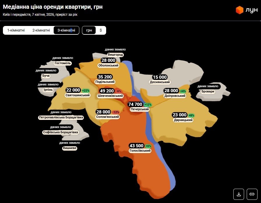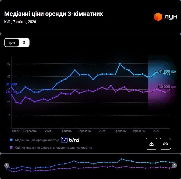 Середня ціна оренди трикімнатної квартири в Києві у квітні 2026 року становить 30 000 грн — тобто піднявся на 6,76%, порівняно з березнем (28 100 грн). Водночас середня ціна на оренду трикімнатних квартир в оголошеннях становить 41 800 грн — орендодавці знизили ціну на 0,95%, порівняно з березнем 2026 (42 200).