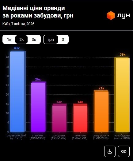 Найвищі ціни на однокімнатні квартири встановлені у будинках таких типів: Новобудови (побудовані після 2010 року) – 21 000 грн. Перша категорія користується попитом завдяки сучасному плануванню, якісному ремонту та розвиненій інфраструктурі. Дореволюційні будинки цінуються за унікальну архітектуру, високі стелі та локацію в історичних кварталах Києва.