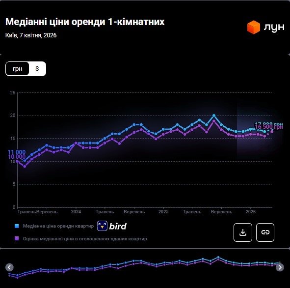 Станом на початок квітня 2026 року оренда однокімнатних квартир у Києві залишається стабільною як з боку пропозицій орендодавців, так і за статистикою укладених договорів. Якщо на початку березня середня вартість складала 15 500 – 16 500 гривень, то на початку квітня ціна становила 16 500 – 17 000 грн, тобто піднялася на 4,7%, згідно з інформацією ЛУН Статистика.