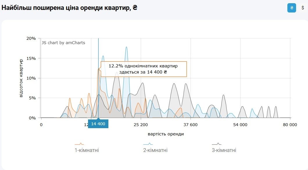 Водночас за даними M2bomber, станом на квітень 2026 року найбільш поширена ціна оренди 1‑кімнатних квартир у Києві становить 14 400 грн, і за такою вартістю здається 12,2% однокімнатних квартир.