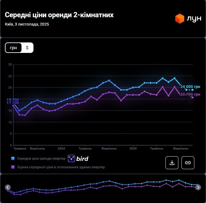 Водночас за даними M2bomber, станом на листопад 2025 року найбільш поширена ціна оренди двокімнатних квартир у Києві становить 18 000 грн, за такою ціною здається 10.4% двокімнатних квартир в Києві.