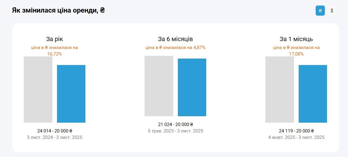 У листопаді 2025 року ринок оренди житла в столиці показує помірні коливання. За інформацією порталу M2bomber, середня вартість оренди квартир у Києві впала на 17% за останній місяць та на 16,72% у річному порівнянні.