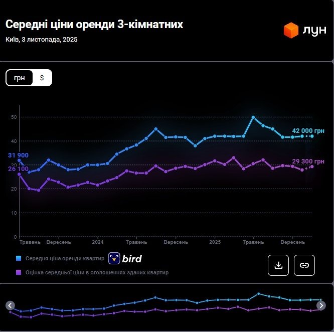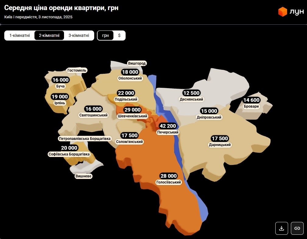 Станом на початок листопада 2025 року оренда однокімнатних квартир у Києві не змінилася, порівняно з минулим місяцем. Якщо на початку жовтня середня вартість становила 15 900 – 17 000 гривень, то до на початку листопада ціна не змінилась, якщо спиратися на дані ЛУН Статистика.