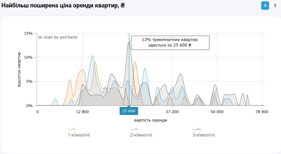 За даними M2bomber, станом на жовтень 2025 року найбільш поширена ціна оренди трикімнатних квартир у Києві становить 25 600 грн, за такою ціною здається 13% квартир.