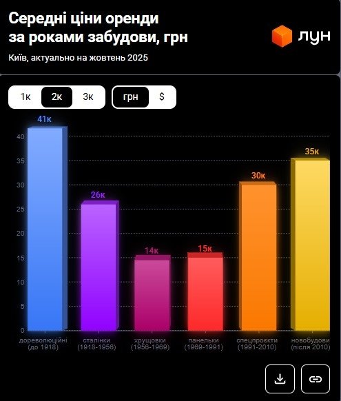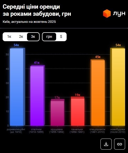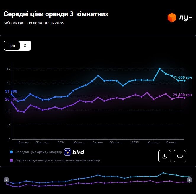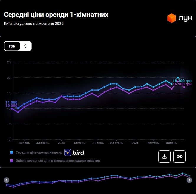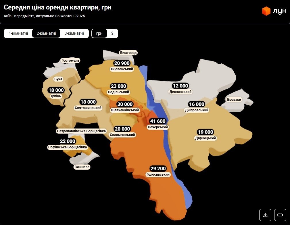Станом на початок жовтня 2025 року оренда однокімнатних квартир у Києві спала на 10% порівняно з минулим місяцем. Якщо на початку вересня середня вартість становила 18 800 – 20 000 гривень, то до жовтня вона впала до 16 900 – 18 000 гривень за даними ЛУН Статистика.