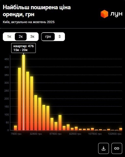 Згідно з даними ЛУН Статистика, станом на жовтень 2025 року найбільш поширена ціна оренди двокімнатних квартир у Києві становить 15 000 – 20 000 грн.