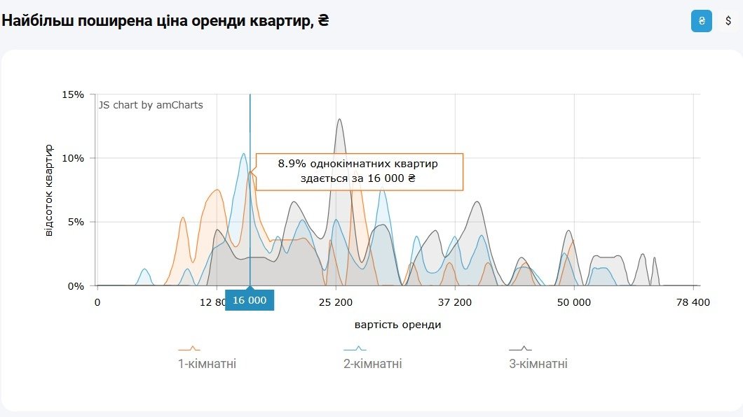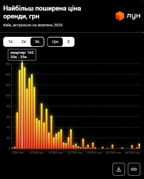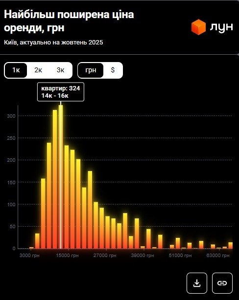 Водночас згідно з даними M2bomber, станом на жовтень 2025 року найбільш поширена ціна оренди 1‑кімнатних квартир у Києві становить 16 000 грн і за такою ціною здається 8.9% однокімнатних квартир. Такий самий відсоток квартир пропонують за ціною 27 000 грн.