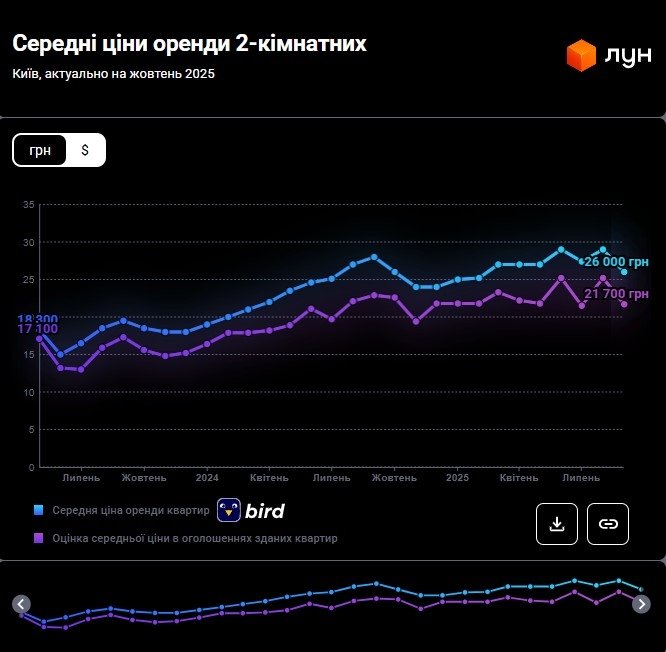Станом на початок жовтня 2025 року оренда двокімнатних квартир у Києві впала на 7–11% порівняно з минулим місяцем. Якщо на початку вересня середня вартість становила 27 500 – 29 000 гривень, то до жовтня вона підвищилась до 21 700 – 26 000 гривень за даними ЛУН Статистика.