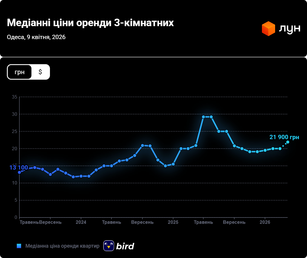 Середня ціна оренди трикімнатної квартири в Одесі у квітні 2026 утримується на рівні березня. Якщо на початку березня 2026 року ціна на оренду трикімнатної квартири в Одесі становила 20 000 грн, то на початку квітня цінова позиція становить 22 000 грн, тобто на 10% більше.