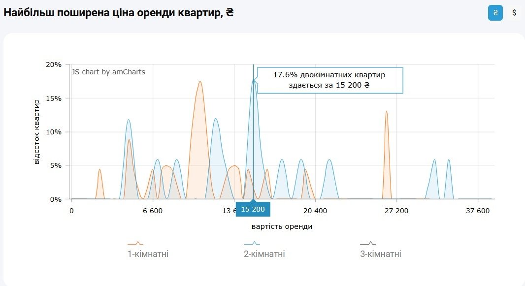 Водночас згідно з даними M2bomber, станом на квітень 2026 року на ринку оренди квартир спостерігається кілька цінових категорій, які найчастіше зустрічаються в однаковому відсотковому співвідношенні 17,4%.