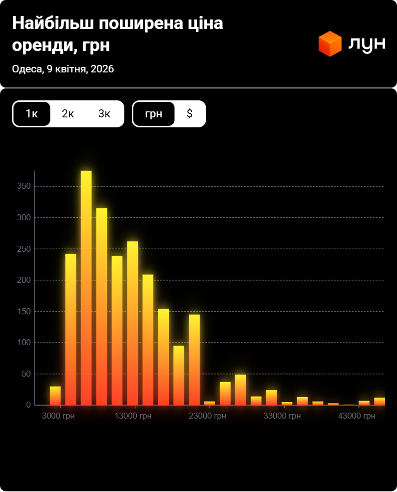 Згідно з даними ЛУН Статистика, станом на квітень 2026 року найбільш поширена ціна оренди 1‑кімнатних квартир в Одесі становить 6 000 – 8 000 грн. Тобто найбільше пропозицій по оренді однокімнатних квартир (383) припадає саме на цей ціновий діапазон, що можна побачити на інфографіці нижче.