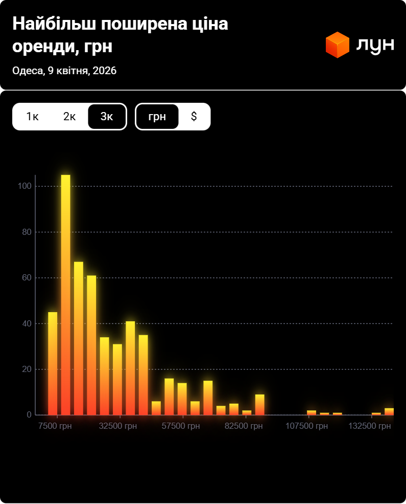 Згідно з даних ЛУН Статистика, станом на квітень 2026 року найбільш поширена ціна оренди трикімнатних квартир в Одесі становить 10 000 – 15 000 грн. Тобто найбільше пропозицій по оренді трикімнатних квартир (113) припадає саме на цей ціновий діапазон, що можна побачити на інфографіці нижче.