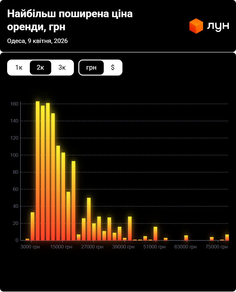 Згідно з даними ЛУН Статистика, станом на квітень 2026 року найбільш поширена ціна оренди двокімнатних квартир в Одесі становить 6 000 – 8 000 грн. Тобто найбільше пропозицій по оренді двокімнатних квартир (167) припадає саме на цей ціновий діапазон, що можна побачити на інфографіці нижче.