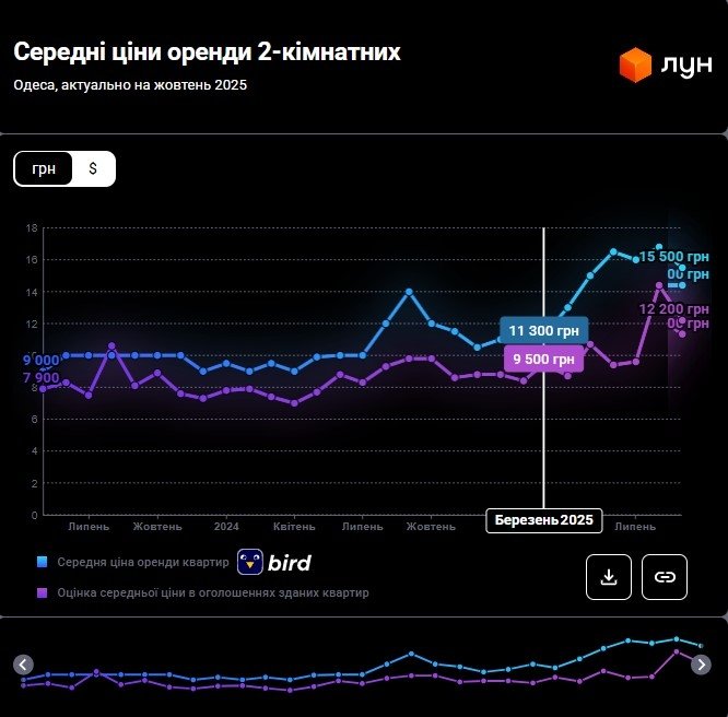 Водночас за даними M2bomber, станом на жовтень 2025 року найбільш поширена ціна оренди двокімнатних квартир у Одесі становить 15 800 грн, за такою ціною здається 21.4% двокімнатних квартир в Одесі.