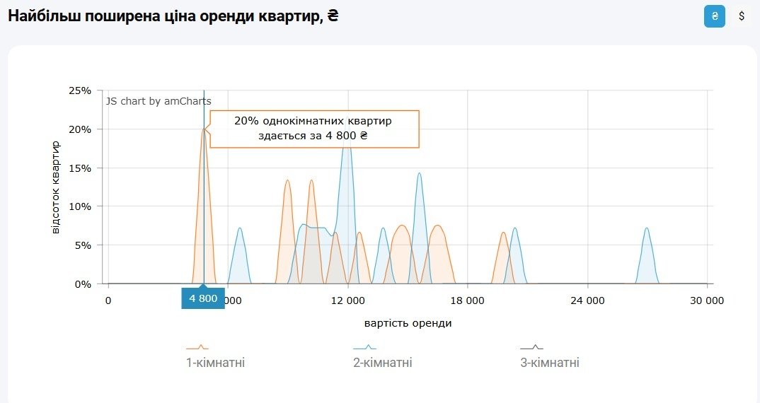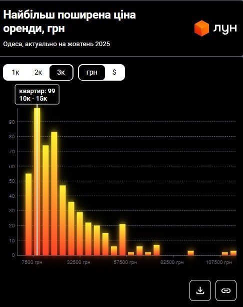 Водночас згідно з даними M2bomber, станом на жовтень 2025 року найбільш поширена ціна оренди 1‑кімнатних квартир у Одесі становить 4 800 грн і за такою ціною здається 20% однокімнатних квартир.